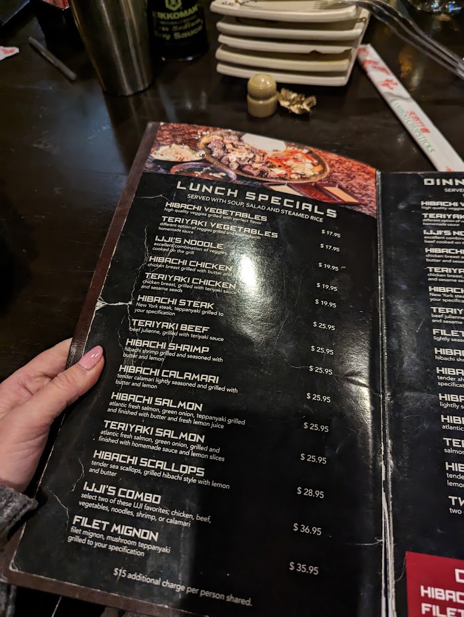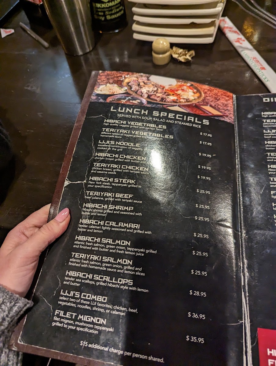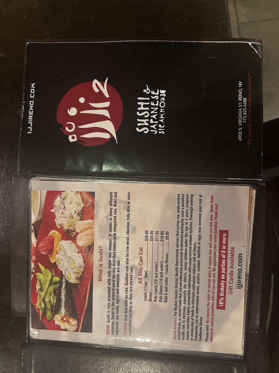 The menu at Ijji 2 features a variety of Japanese cuisine with a focus on sushi and hibachi-style dishes. It is designed for casual dining, suitable for lunch or dinner occasions where guests can enjoy a range of light bites, main courses, and desserts.