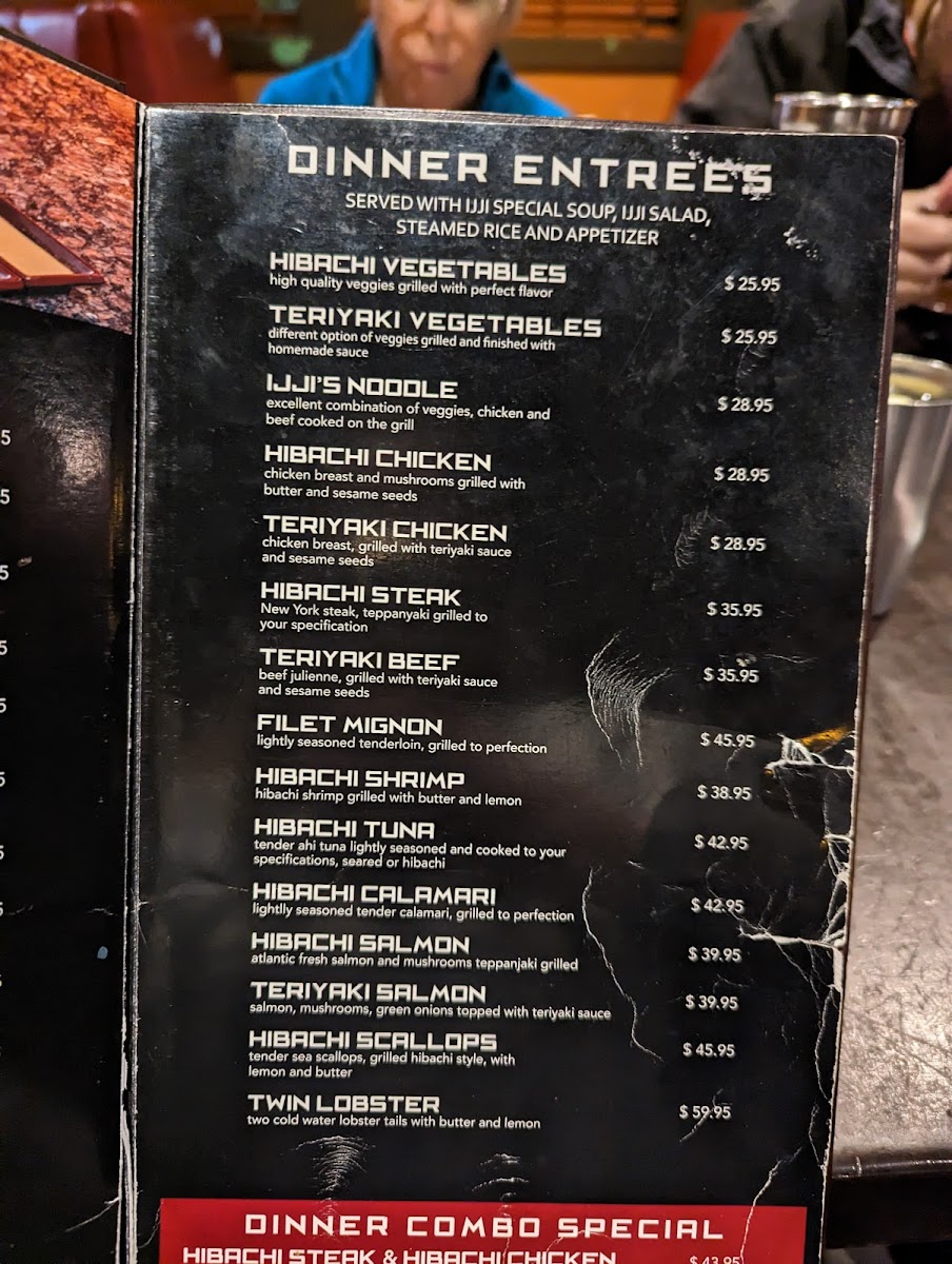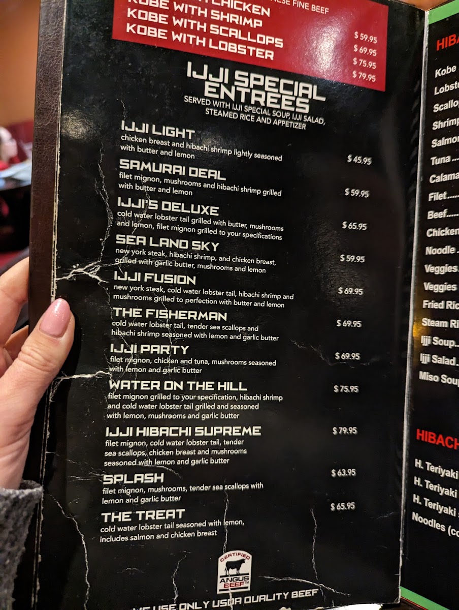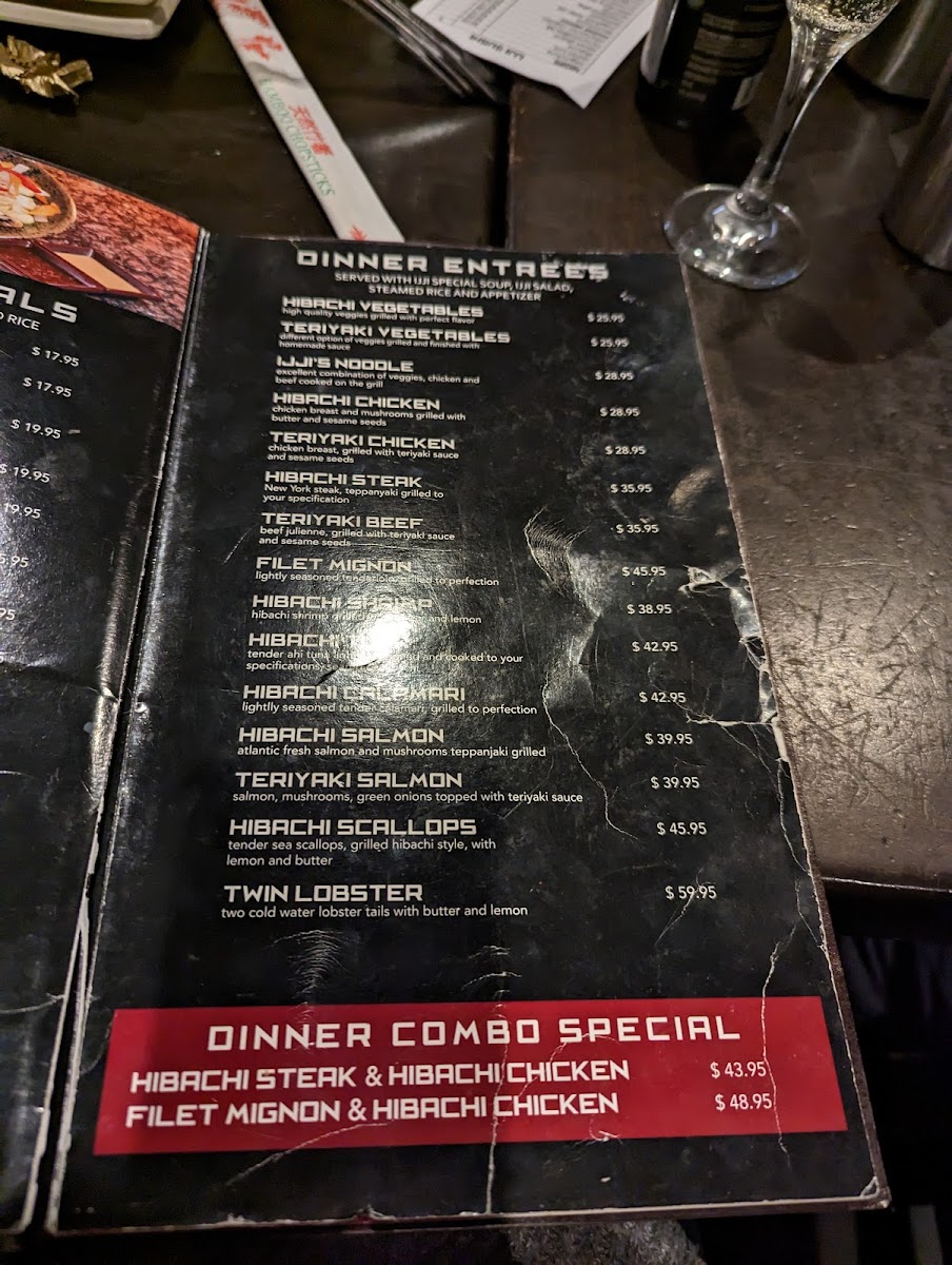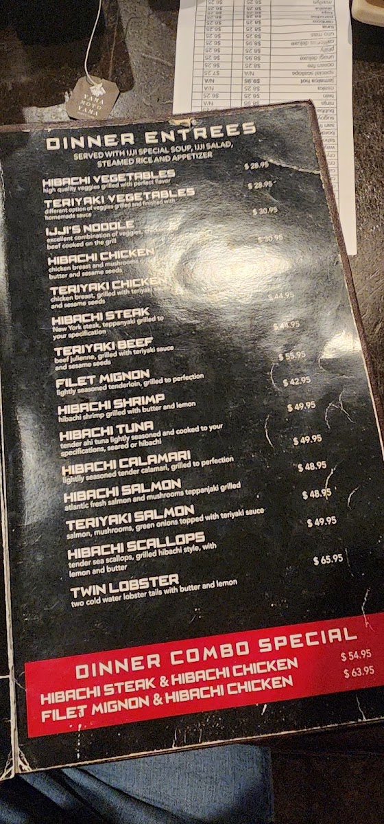 The menu at Ijji 2 features a variety of Japanese cuisine with a focus on sushi and hibachi-style dishes. It is designed for casual dining, suitable for lunch or dinner occasions where guests can enjoy a range of light bites, main courses, and desserts.
