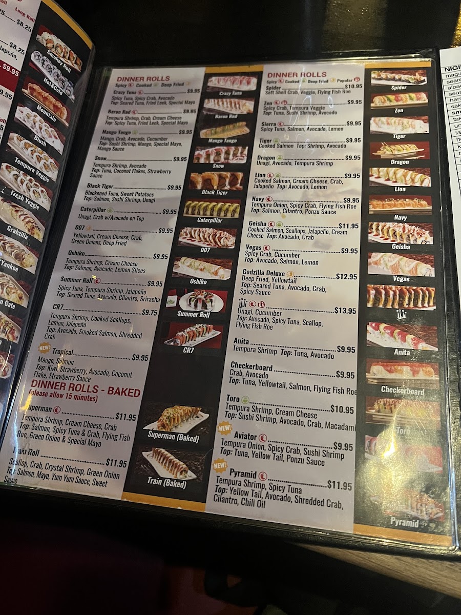 - Baked Rolls: Features rolls like the Train Roll with scallop and crystal shrimp, Angry Roll with cream cheese and scallops, and the Superman Roll combining tempura shrimp and spicy tuna.